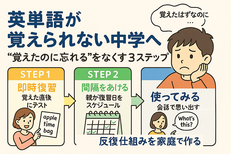 また、小学生英語で習った単語は全て書けるものとして始まるので、中1の段階でのギャップが凄いです。ここを家庭学習で埋めないと、積み上げである英語はかなり苦しくなります。