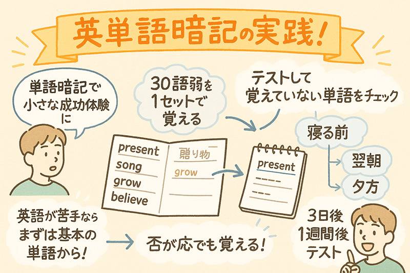 英単語の覚え方を実際にやってみた【実例紹介】 以前の記事「英単語が覚えられない中学生へ」では、英単語暗記のコツを紹介しました。今回はその内容を、実際に我が家で取り組んでいるリアルな実践法として紹介します。 英語が苦手な中1にとって、最初の壁...