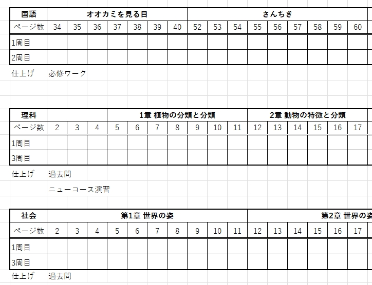 テスト1週間前の日曜は、「全ての学校ワークが1周終わっているか」をチェックします。この2周目こそが学力を上げるのに最重要なことであることを再度確認します。